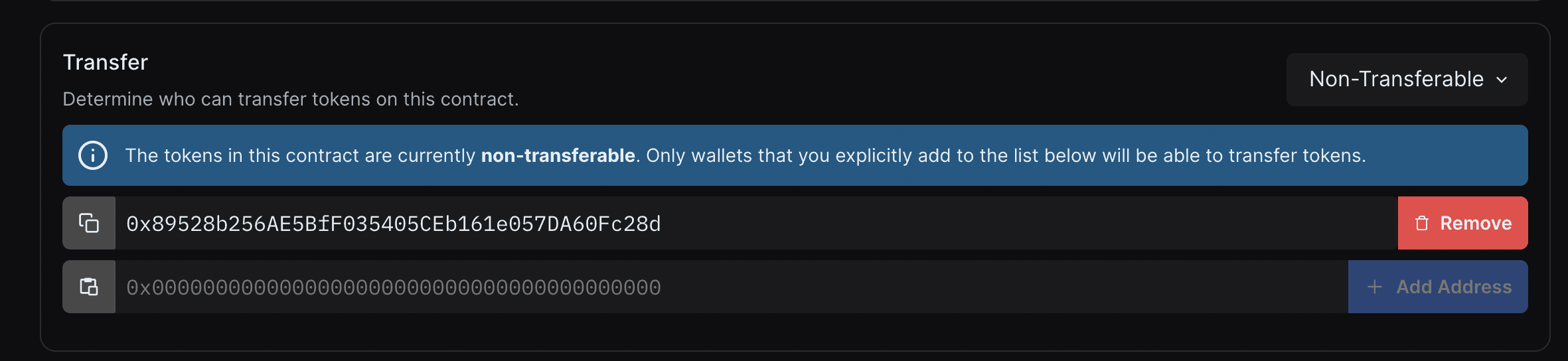 Enter 0x0000000000000000000000000000000000000000 to revoke transfer rights from every wallet.